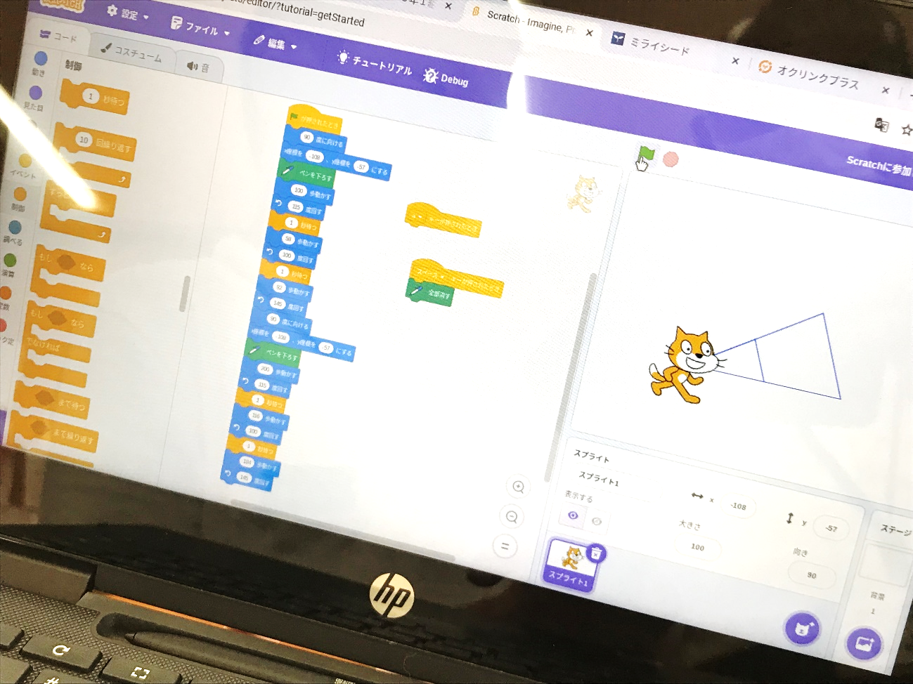 プログラミングするには,拡大図とはどういうもので,どういう条件が必要かがわかっていなくてはなりませんね。それぞれのグループの中で,手で描く子やプログミングする子がいて,役割分担して学習を進めているそうです。