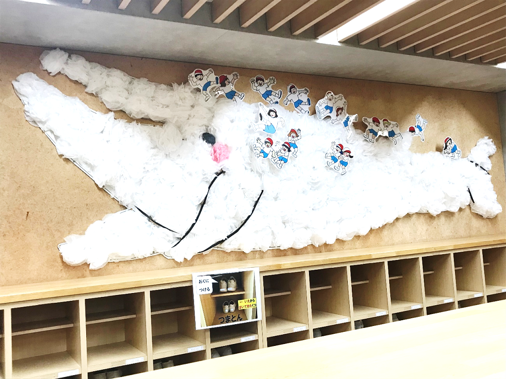 低学年玄関の壁には,スイミーの掲示と,くじらぐもの掲示がありました。くじらぐもは経年によって白色がくすんできていて「あたらしくできるといいね」と,前々から話していたわけです。