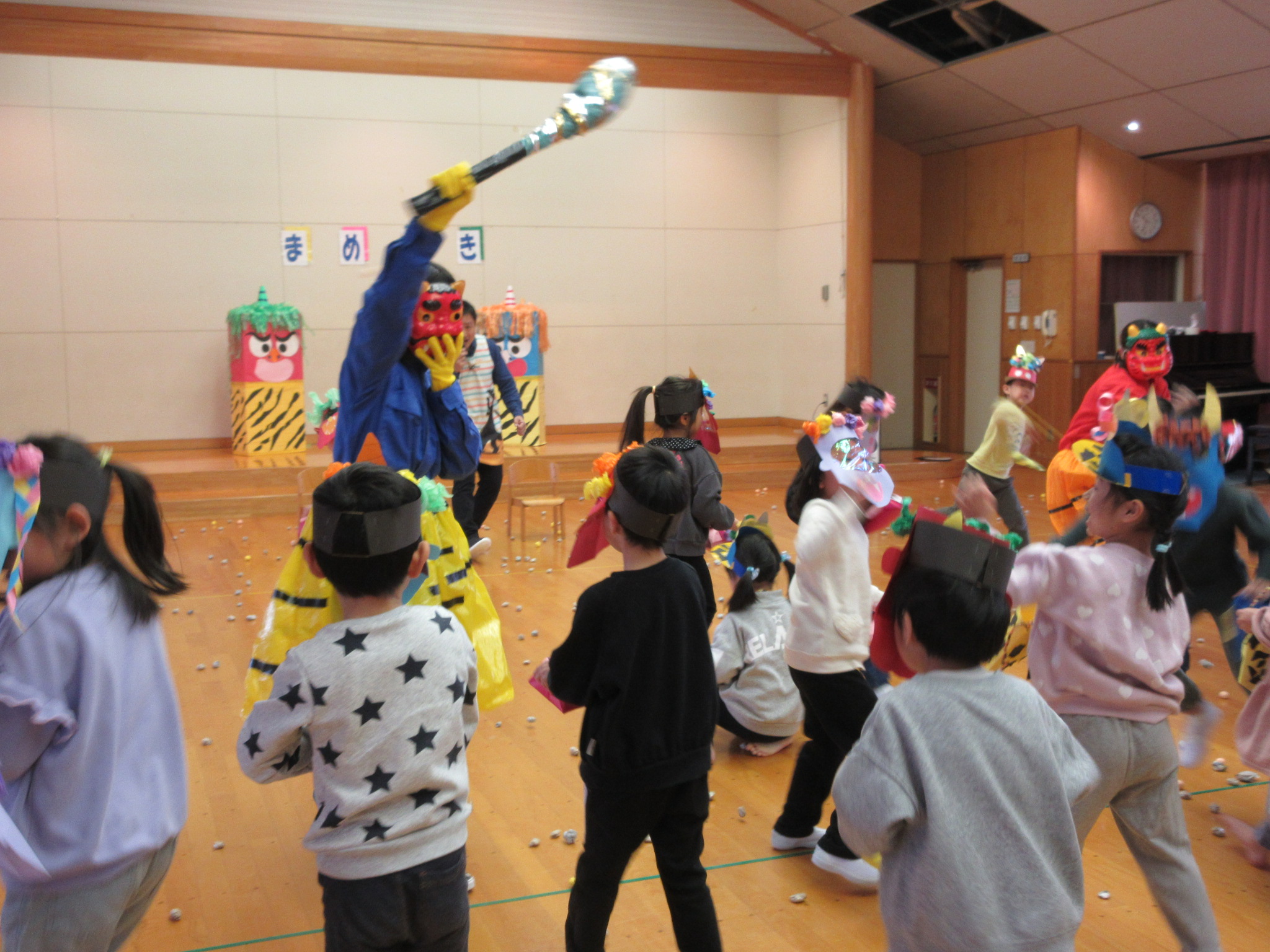2月3日(月)に豆まき集会をしました。手作りのお面をつけて「おには~そと」とお腹の中にいる鬼を退治しました。 給食の鬼さんライスに「かわいい~」と子どもたちも大喜びでした。
