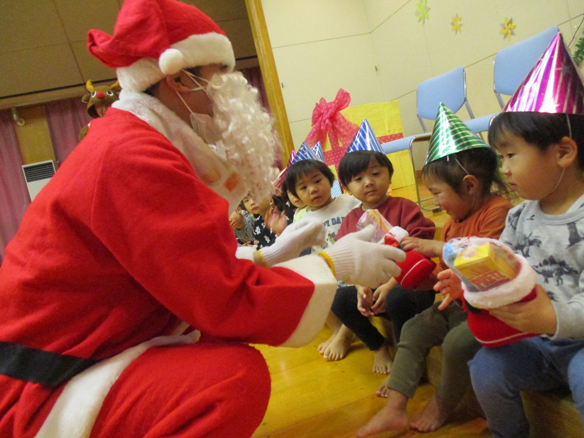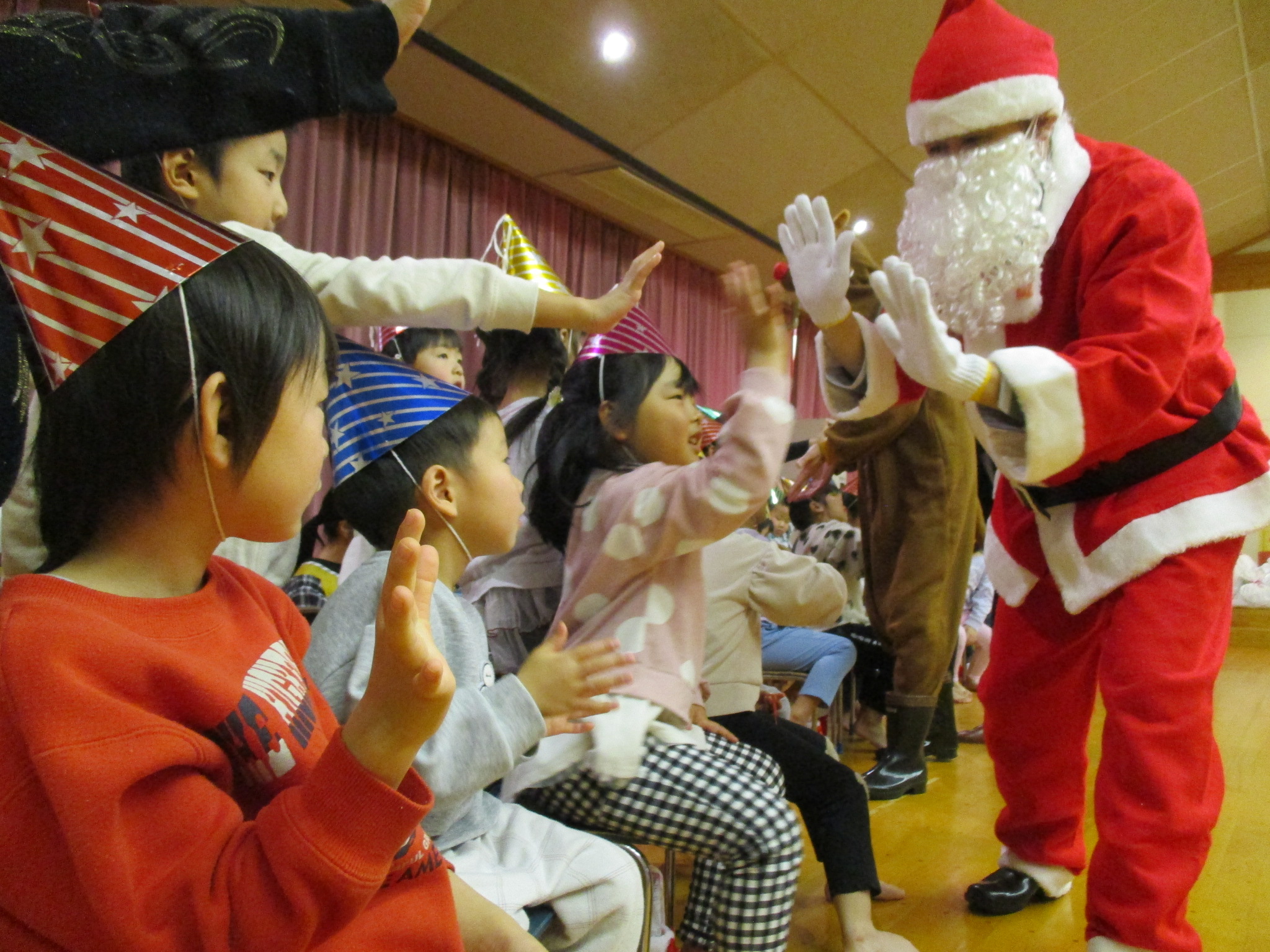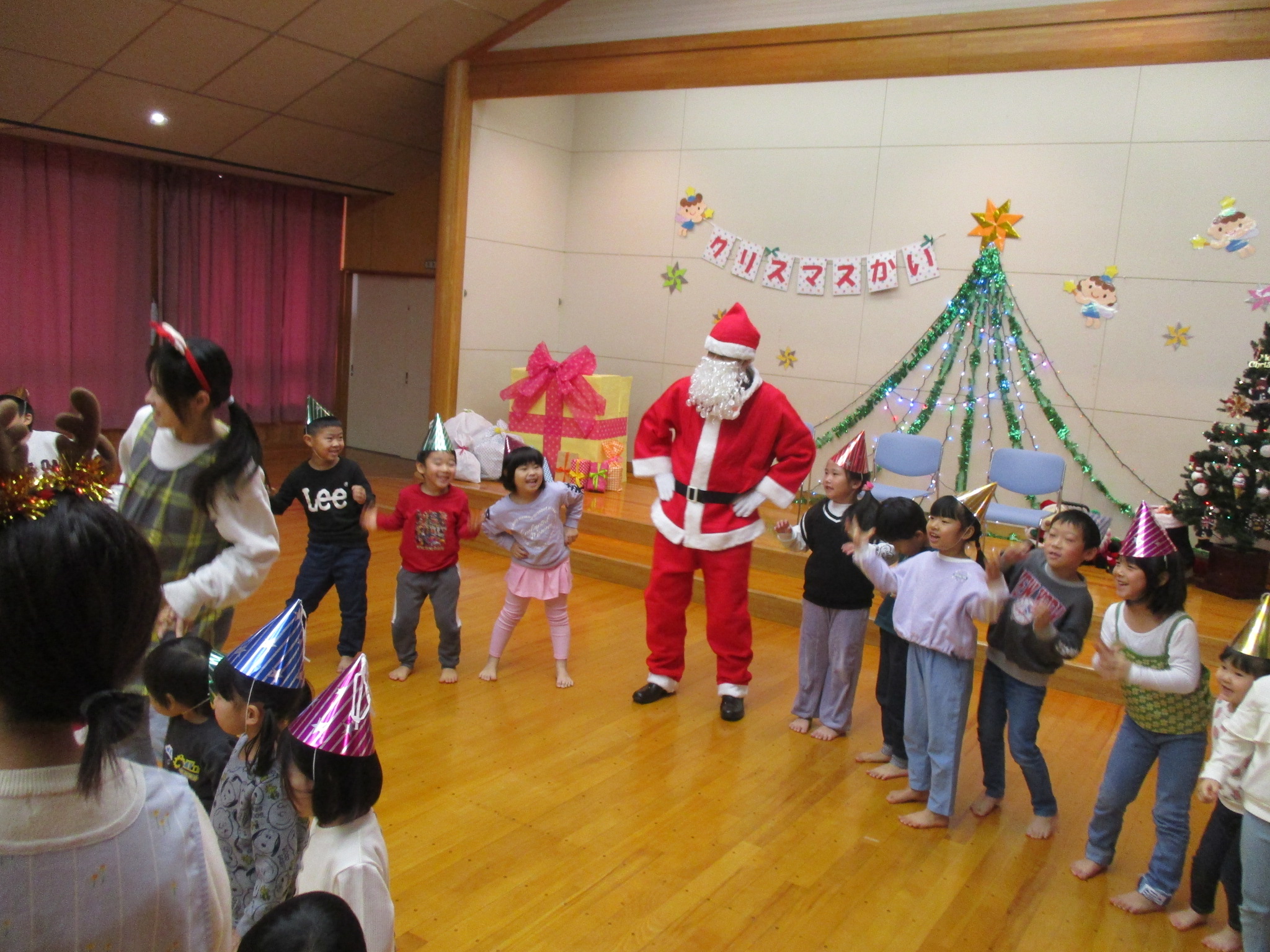 12月23日(火曜日)クリスマス会がありました。鈴の音が鳴ると、サンタさんはどこにいるのかと探していた子ども達。大きなプレゼントの箱の中から登場したサンタさんに大喜び!ハンドベル演奏、楽しいダンスなど、大盛り上がりの時間でした♪
