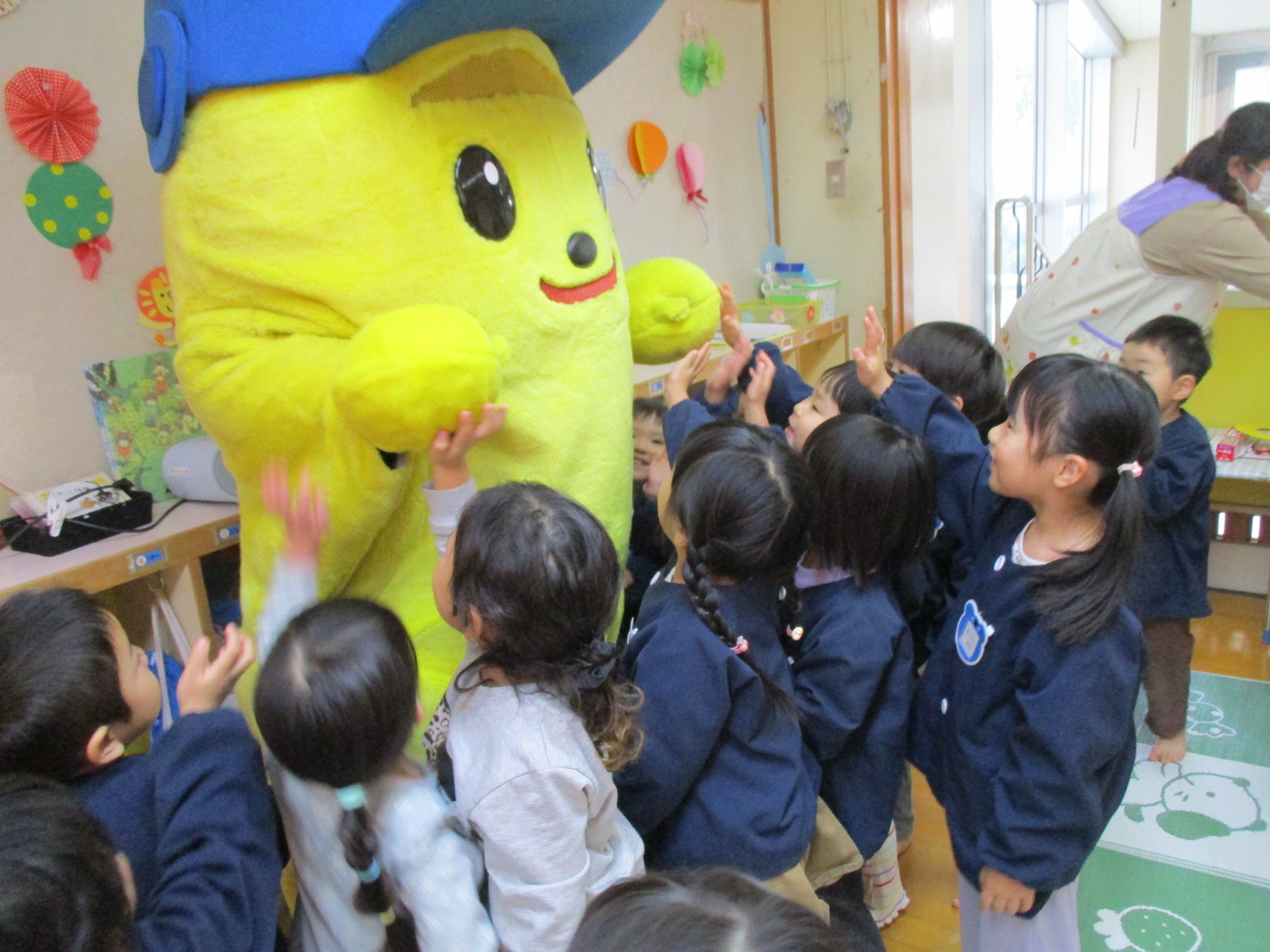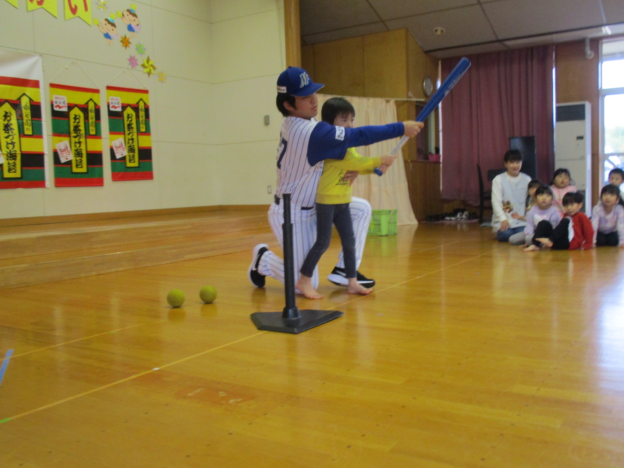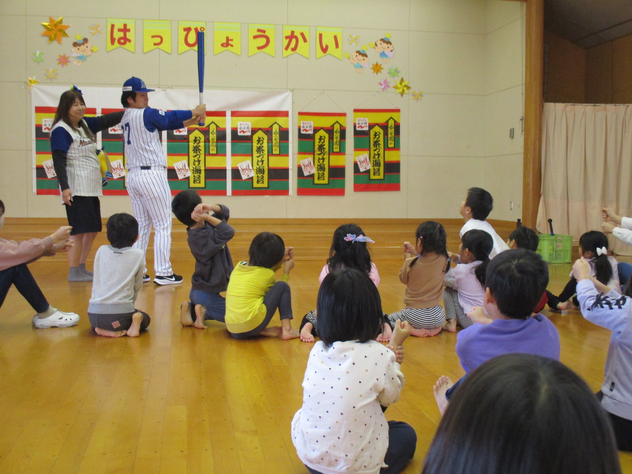 4日(木)にミリオンスターズとの交流会がありました。野球選手とハイタッチしたり、バットの持ち方を教えてもらい、一人一人ボールを打ったりして楽しみました!バットに当たると歓声が上がり、大盛り上がりでしたよ! お部屋にはスタ坊が遊びに来てくれ、写真撮影もしました。貴重な体験に大喜びしていた子ども達です(*^^*)