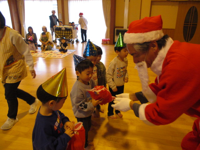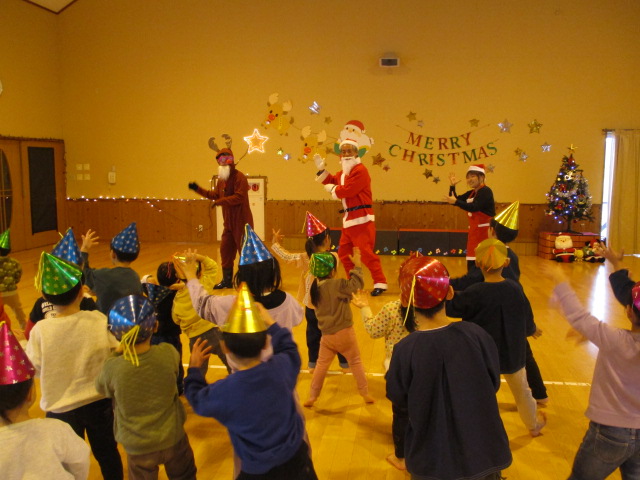 12月23日(火)に、クリスマス会がありました。 サンタさんの登場に、大喜びの子どもたち。サンタさんに質問したり、一緒に踊りを踊ったりして楽しい時間を過ごしました。プレゼントを貰うとにっこり笑顔でした。