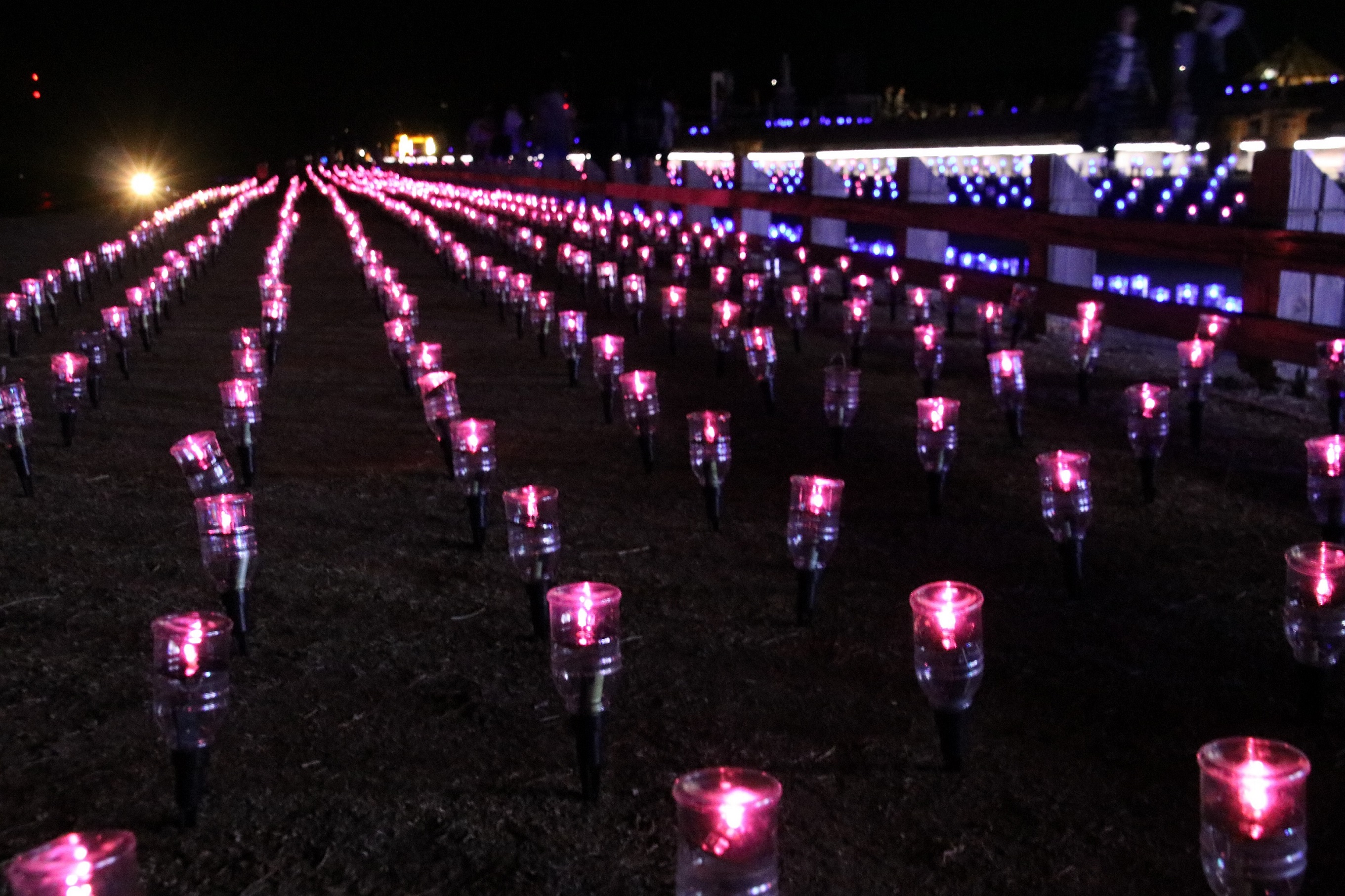 西能登志賀町の増穂浦海岸にある、世界一長いベンチ周辺を LED照明「ペットボタル」の灯りが彩るイルミネーションイベント。