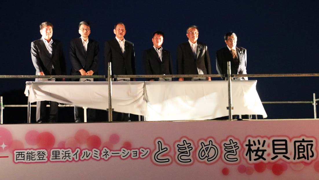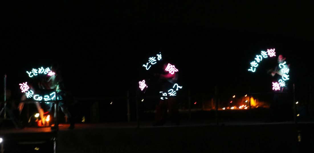 ![]() ![]() ![]() 午後七時には、志賀疾風太鼓保存会による太鼓演奏、志賀町賑わい創出委員会の寺岡委員長・小泉町長らのあいさつの後、点灯のカウントダウンで、一斉に撮影スポットやベンチを照らすLEDライトに明かりが灯り、幻想的な風景が浮かび上がりました。 ![]() ![]() ![]() 撮影スポットや世界一長いベンチには、大勢の来場者が集まりました。 ![]() ![]() ![]() ![]() ![]() 特設会場では、火付盗賊(東京)出演による炎を光のファイヤーパフォーマンスショーが繰り広げられ、会場を沸かせました。 ![]() フィナーレは、北國花火志賀大会で幕を閉じました。 |