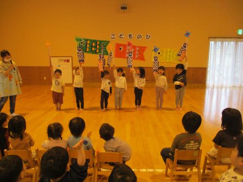 5月2日(金曜日)子どもの日の集いがありました。こいのぼりくぐりのゲームやみんなで元気いっぱい、たけのこ体操をして楽しみました。